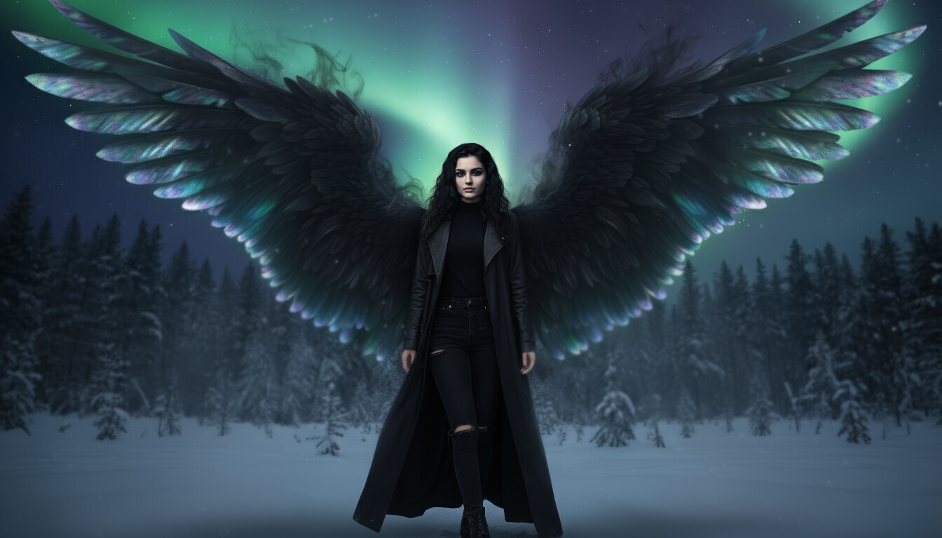Крылатая со всеми особенностями. Цвет крыльев: черный, дымный, с переливами в цветах северного сияния на краях.